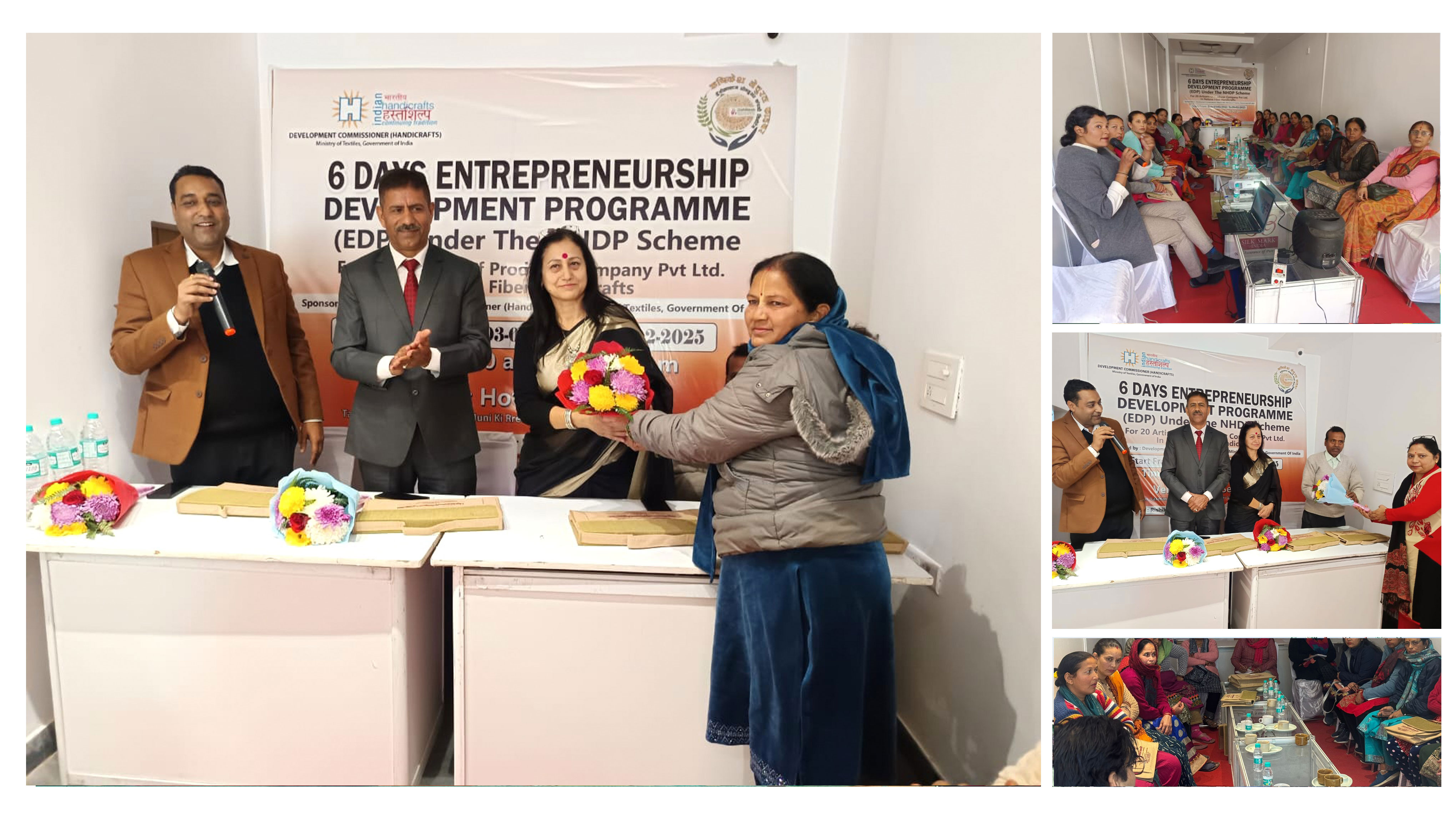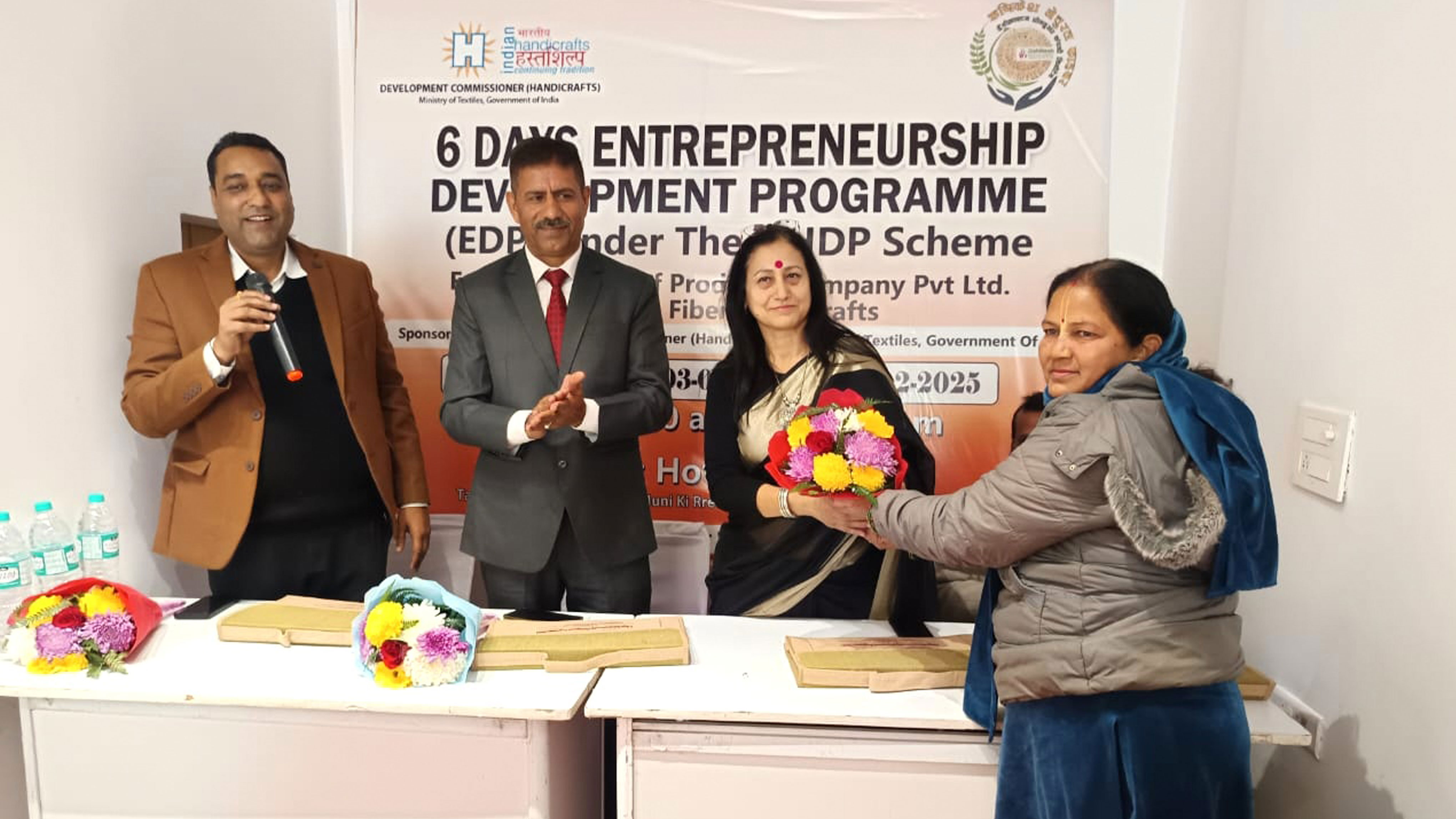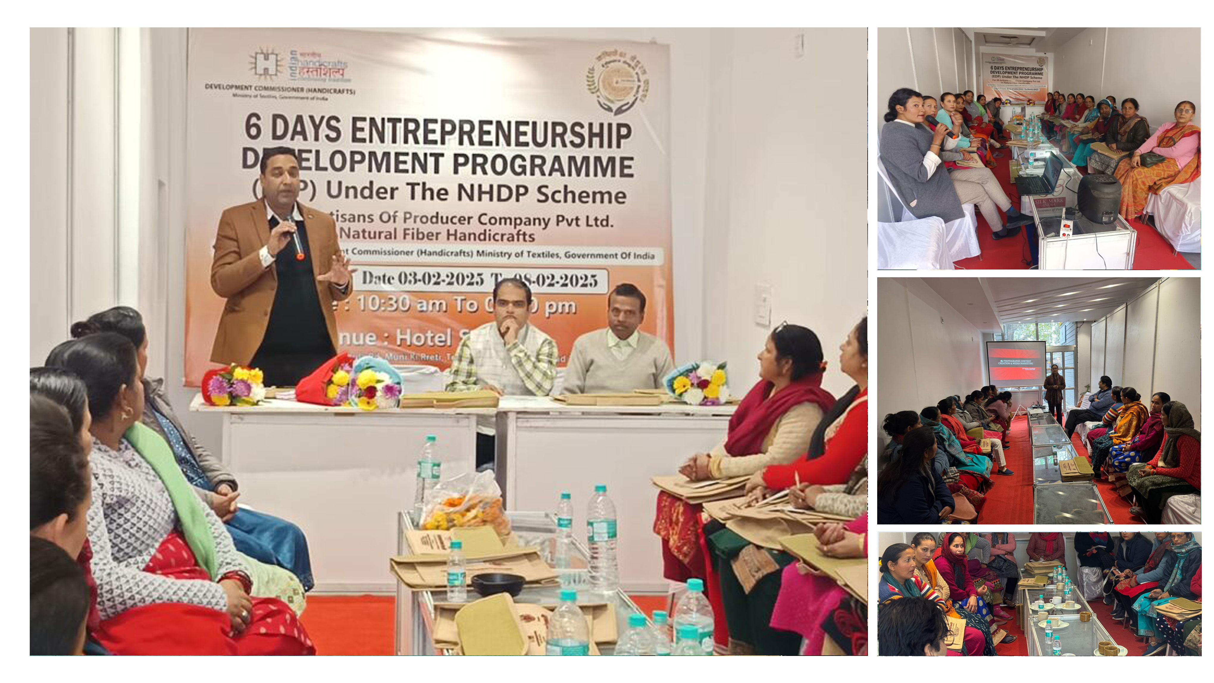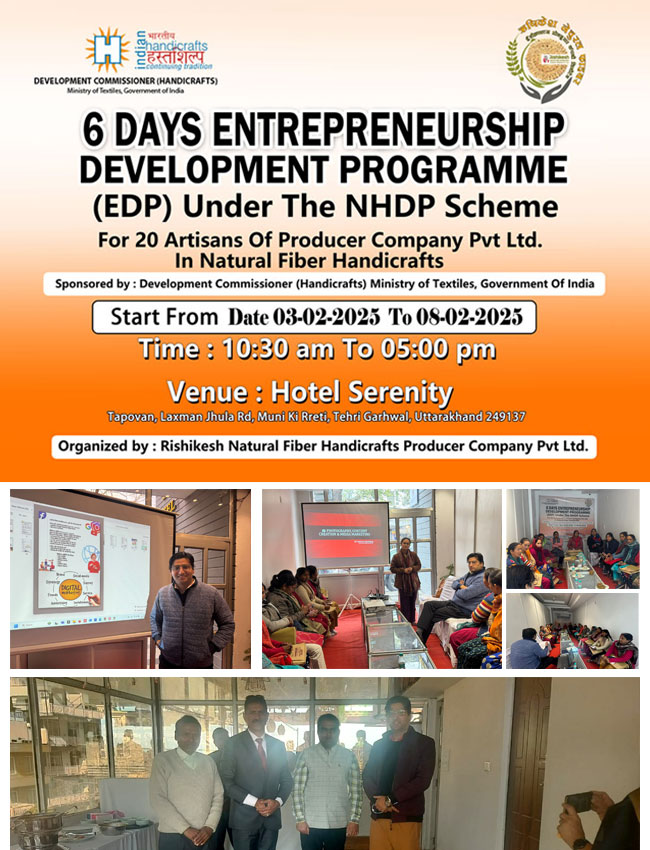 The 6-day Entrepreneurship Development Program (EDP) organized by Rishikesh Natural Fiber Handicrafts Producer Company Limited stands as a significant step toward empowering grassroots artisans and promoting sustainable entrepreneurship in Uttarakhand. With focused training, expert mentorship, and exposure to modern business practices, the program successfully bridged the gap between traditional craftsmanship and contemporary market demands. It not only enhanced the professional capabilities of participating artisans—especially women—but also aligned with the national vision of Atmanirbhar Bharat by fostering self-reliance and economic upliftment through skill development. The enthusiastic participation, impactful sessions, and strong institutional support made this EDP a model initiative for artisan-led growth and rural enterprise development.