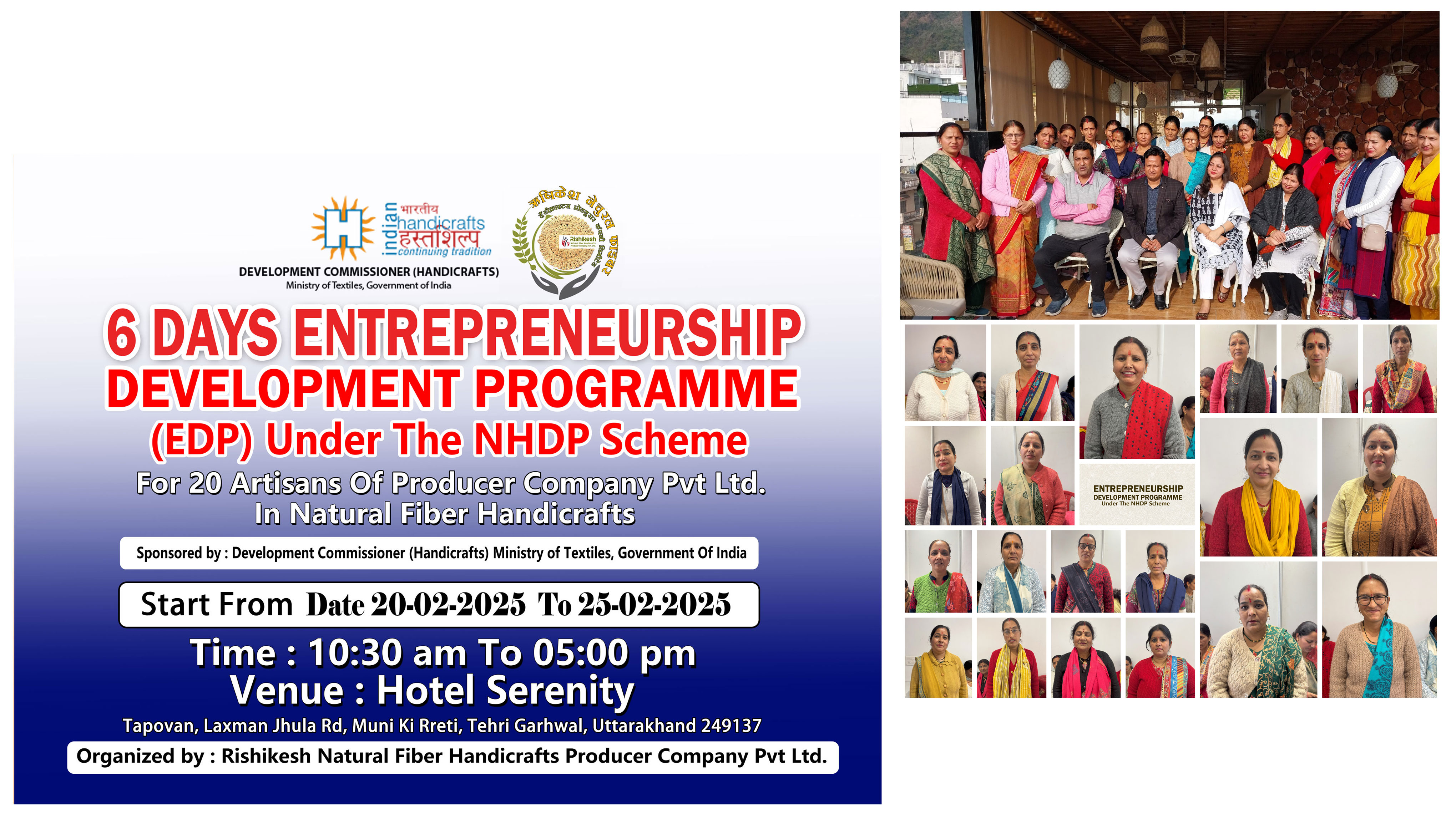 Rishikesh Natural Fiber Handicrafts Producer Company Limited today inaugurated a 6-day Entrepreneurship Development Program (EDP), scheduled from February 20 to February 25, 2025. The program is sponsored by the Office of the Development Commissioner (Handicrafts), Ministry of Textiles, Government of India, and aims to empower artisans and entrepreneurs associated with the natural fiber handicraft sector of Uttarakhand.
