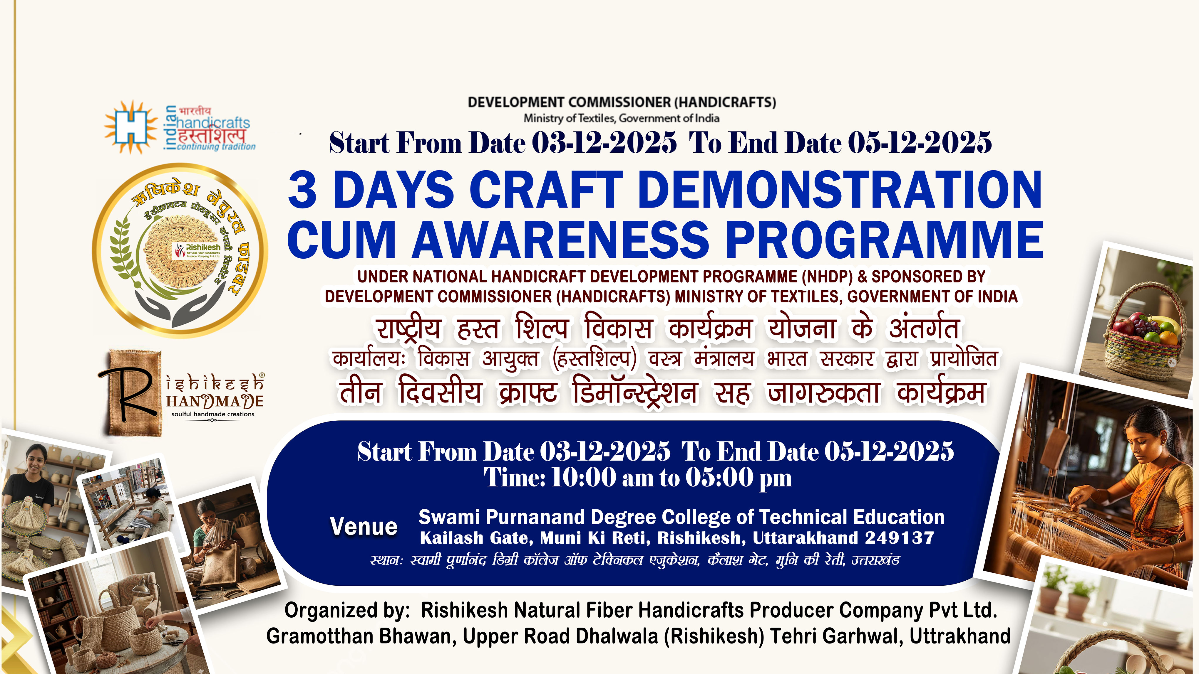 3 Days Craft Demonstration-cum-Awareness Programme (03.12.2025 to 05.12.2025) Orgenized By M/s Rishikesh Natural Fiber Handicrafts Producer Company Limited The programme will be held at: Swami Purnanand Degree College of Technical Education, Kailash Gate, Muni Ki Reti, Rishikesh, Uttarakhand тАУ 249137. This event is sponsored by the supported by the Development Commissioner (Handicrafts), Ministry of Textiles, Government of India. This programme is designed to empower artisans and entrepreneurs working in the handicrafts sector, with a special focus on the natural fiber handicrafts of Uttarakhand.