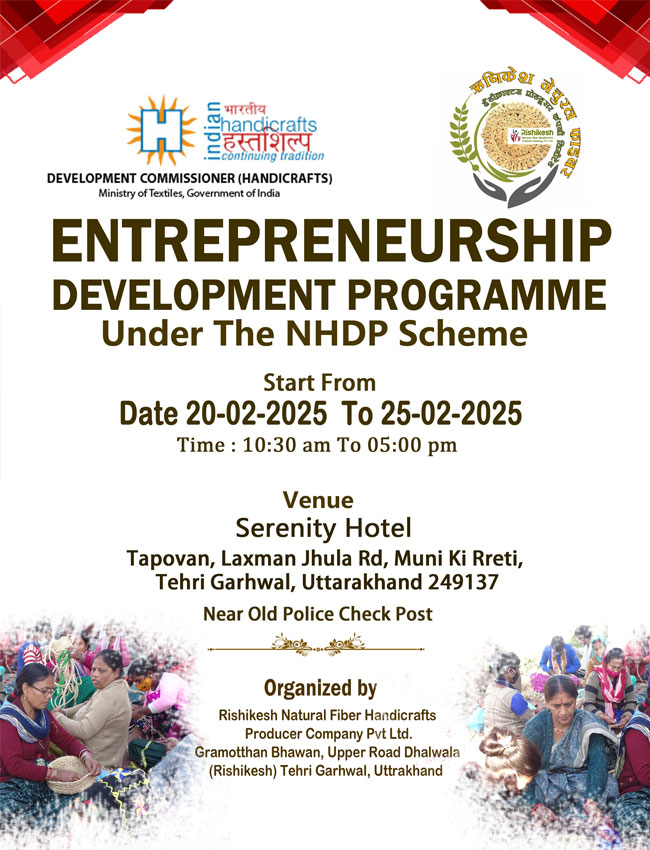 Rishikesh Natural Fiber Handicrafts Producer Company Limited today inaugurated a 6-day Entrepreneurship Development Program (EDP), scheduled from February 20 to February 25, 2025. The program is sponsored by the Office of the Development Commissioner (Handicrafts), Ministry of Textiles, Government of India, and aims to empower artisans and entrepreneurs associated with the natural fiber handicraft sector of Uttarakhand.